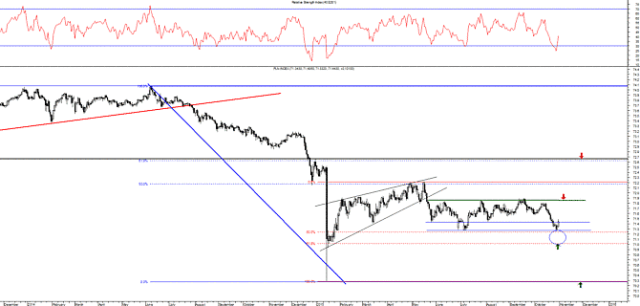 Indeks syntetyczny złotego w zeszłym tygodniu przetestował wakacyjne minima zanotowane na początku lipca (poziom 71,3 pkt.). Test tego wsparcia wypadł pozytywnie i w końcówce tygodnia indeks odbił. Wcześniej, w połowie października znalazł się ponownie w okolicy poziomu kilkumiesięcznych szczytów i jednocześnie górnego ograniczenia średnioterminowej konsolidacji (71,85 pkt.). Wtedy jednak przewagę na indeksie przejęła strona podażowa i ruszył on w kierunku południowym, co skutkowało zeszłotygodniowym testem wspomnianych minimów i jednocześnie dolnego ograniczenia średnioterminowej konsolidacji (71,45 pkt.). W przypadku sforsowania tego wsparcia celem strony podażowej byłby poziom 61,8% zniesienia odbicia budującego się od połowy stycznia do połowy maja br. (71 pkt.). Wyznacza on kluczowe wsparcie dla tego instrumentu, pokonanie którego pozwoliłoby na pogłębienie spadków do historycznych dołków z początku roku (patrz wykres).